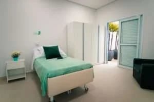 Quarto com visão para o jardim, adaptado para acamados e banheiro amplo.